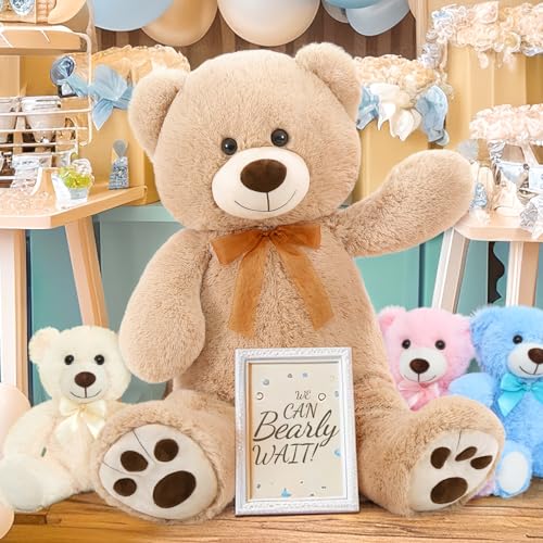 - We Can Bearly Wait: Don't miss out this eye-catching teddy bear for bear themed baby shower decorations! Our 3-foot-tall giant teddy bear is very cuddling and snuggling thanks to its premium materials. The large teddy bear is made from high-quality faux fur and stuffing to ensure every bear-lover has the cuddliest plush bear toy;