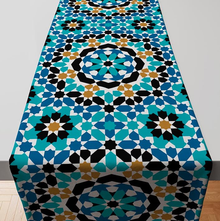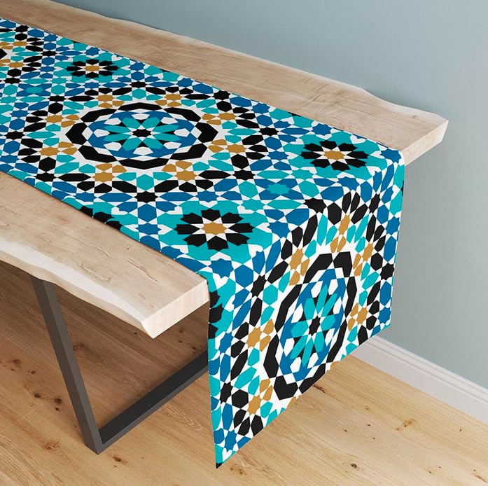 Generic - مفرش طاولة خيامية بنمط هندسي من موروكان ستار بلون تركواز وازرق واسود وذهبي، مقاس 155×38 سم، تصميم مربع مطبوع