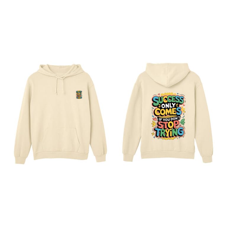 Generic - هودي تحفيزي مع اقتباس نجاح، بيج، جيب امامي، غطاء راس برباط، طباعة خلفية ملونة، مقاس (S)