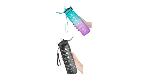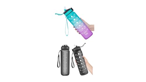 Generic - زجاجة مياه رياضية كبيرة وتحفيزية مع مؤشرات زمنية سعة 1 لتر بتدرج لوني فيروزي وأرجواني وغطاء محكم الإغلاق ومانع للتسرب وجهاز تتبع لمستوى الترطيب، طقم مكون من قطعتين