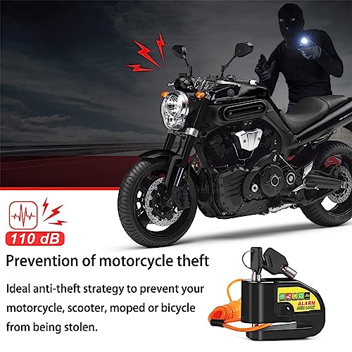 ABVSO - قفل فرامل قرصي مع انذار للدراجات النارية، قفل قرصي امان لعجل الدراجات النارية لمنع السرقة للدراجات النارية والدراجات، مع صوت انذار 110 ديسيبل مع كابل تذكير بطول 1.5 متر (أسود)