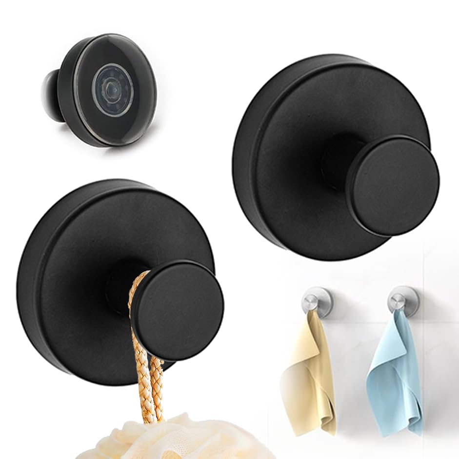 MOTYCTCH - Suction Cup Hooks for Shower,Hanging Towels, Robe, Loofah, Kitchen, No-Drill Hooks for Bathroom Wall, Stainless Steel Waterproof Suction Cup Hooks for Glass,Mirror(Black*2)