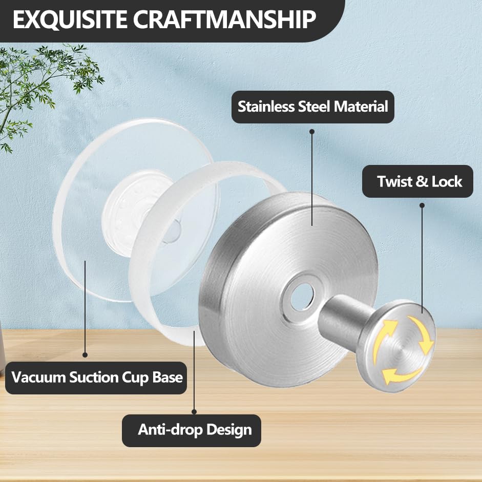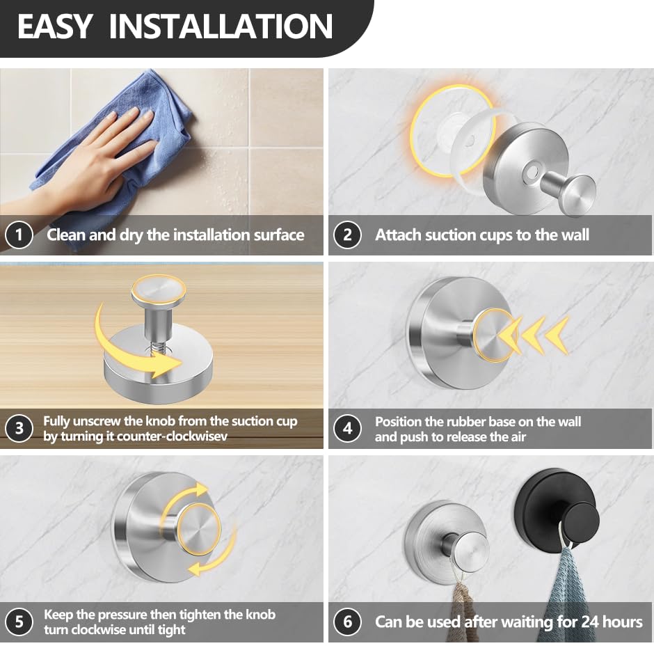 - 【High-Quality Material】The suction cup towel hooks are made of high-quality stainless steel,rugged, waterproof and modern design. Each hook can hold up to 15 lbs, suitable for bathrobes, shower balls, brushes, coats, hanging towels, clothes and more.