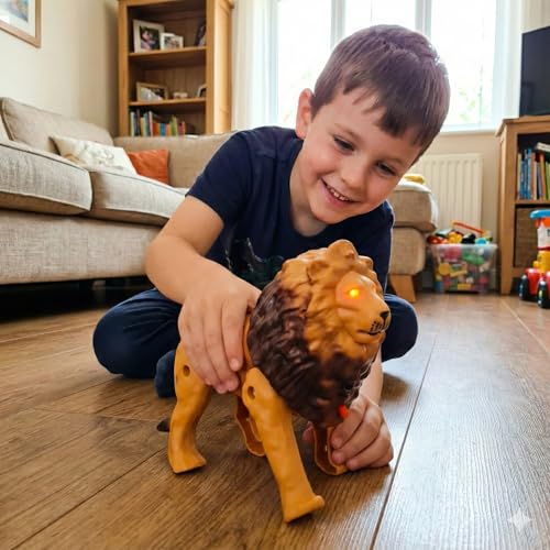 - Electric Lion Toy Reactive: the Jungle King Realistic Figure with LED Eyes Lights and Real Roar Sounds for a fun, exciting play experience for kids