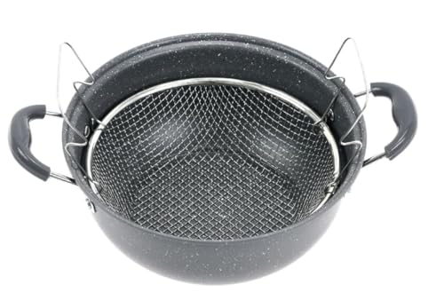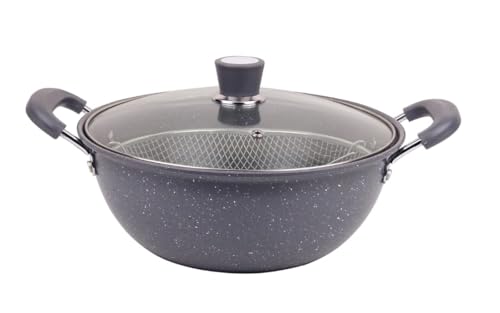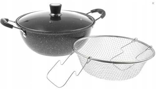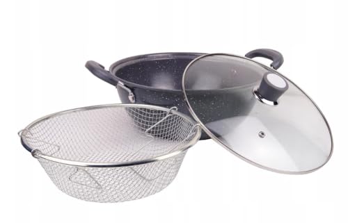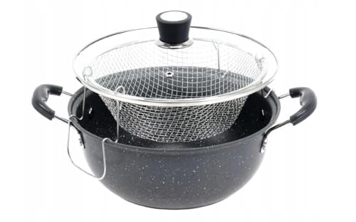 MUGATH - طاسة قلي عميقة من موجاث مع سلة مصفاة لقلي البطاطس المقلية / أجنحة الفراخ / الروبيان / الأسماك / الزبدة المغلية / الصلصة / الشوربة / المكرونة | مقلاة مع غطاء زجاج للسوتيه والكاري والتحمير (24 سم)