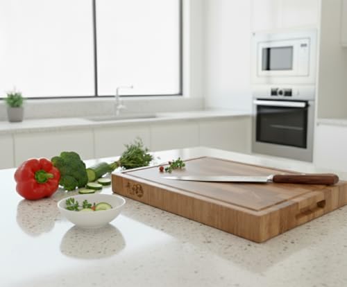 - [كبير للغاية وشديد التحمل] - بوزن 5.2 كجم، يبقى لوح التقطيع الخشبي الصلب هذا ثابتًا في مكانه، مما يوفر ثباتًا لا مثيل له سواء كنت تقوم بإعداد الخضروات أو تقطيع اللحوم أو تقديم الجبن.