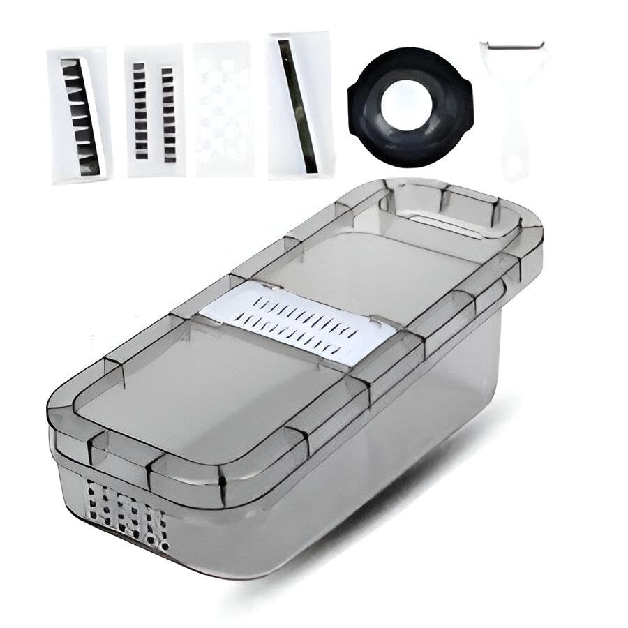 Generic - Multi-Function Slicer - Compact kitchen tool with six blades for julienne, fine and crinkle cuts, carrot & potato graters, built‑in container, black‑transparent finish for quick fruit and veg slicing.