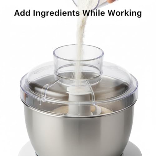 - غطاء شفاف مع فتحة إضافة مكونات يسمح بإضافة الماء أو الدقيق أثناء التشغيل بدون فتح الغطاء.