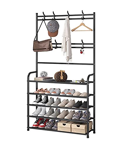Generic - Multifunctional Entryway Coat Rack 5 Tier 3 in 1 Hall Tree Shoe Bench with Keys Hat Umbrella Stand Storage Shelves with 8 Hooks Hanger 5 Bottom Layer Organizer (170 x 80 x 26 cm/Black, Metal)