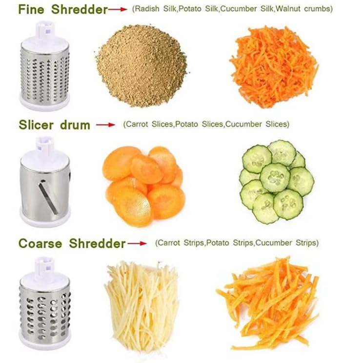 - 3 assorted blades: the first blade is ideal for cutting vegetables into thin slices, the second blade works on soft humans of nuts, seeds, and garlic, and the third blade is designed for rough humans for cheese, vegetables, carrots, and potatoes