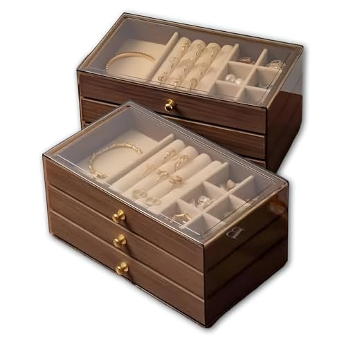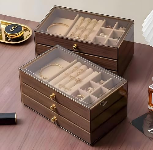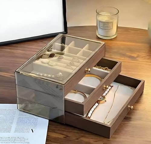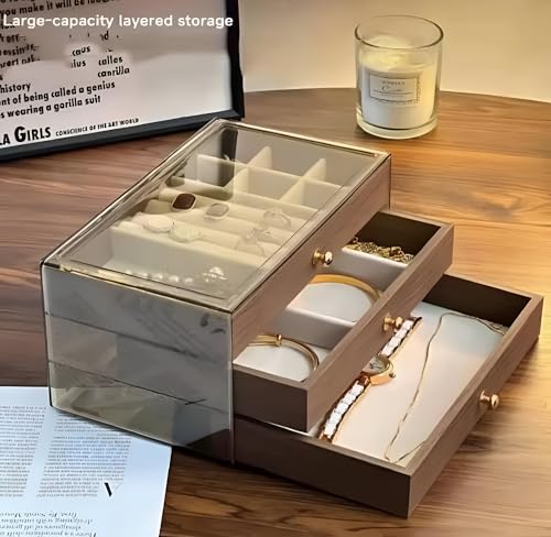- The multi-drawer design includes three spacious compartments plus a clear-top display section, offering dedicated, velvet-lined spaces for rings, earrings, bracelets, necklaces, and watches to prevent tangling and scratches.