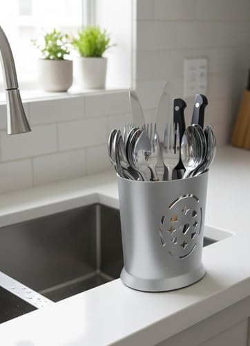 - Multi-purpose Cutlery Holder (for spoons, forks, and knives) and utensil caddy. Modern design with a matte silver/metallic finish that complements contemporary kitchen décor. Features decorative laser-cut star and heart patterns for optimal ventilation and water drainage. Ideal for use as a countertop utensil organizer or a drying caddy/drainer next to the sink. Helps keep flatware organized, accessible, and dry in the kitchen.