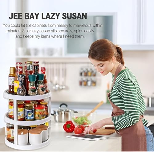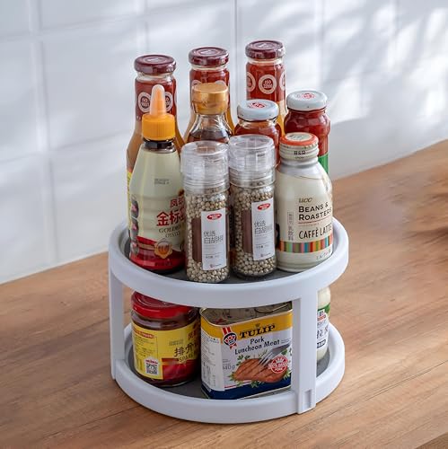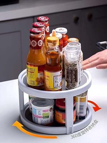 - The organizer consists of two rotating tiers, each with a 360-degree spin that makes accessing your items effortless. Whether you're storing spices, jars, or cosmetics, the turntable provides easy access to all your products without straining or searching through piles of things.