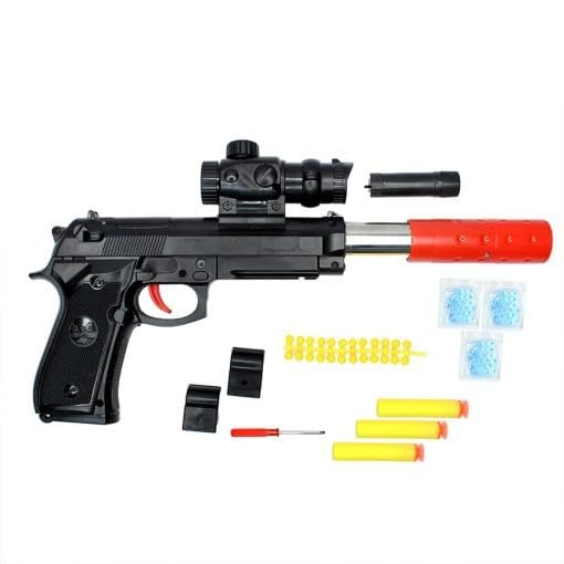 - مزايا التصميم: مسدس لعبة ذو مظهر واقعي مع منظار مثبت وملحق كاتم صوت قابل للفصل لتجربة لعب محسنة