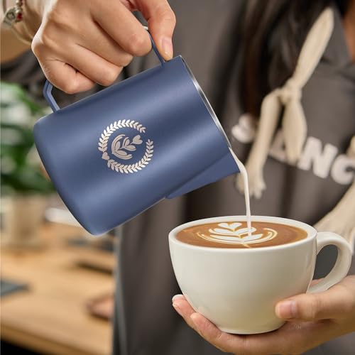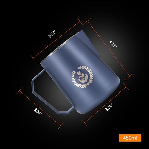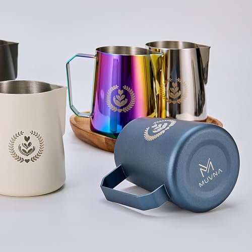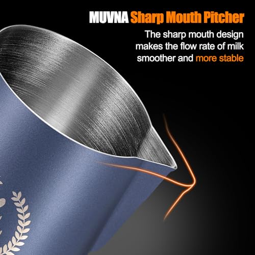 MUVNA - Milk Frothing Pitcher 15.4oz/450ml - Stainless Steel Jug Frother Steamer Cup for Latte Art, Cappuccino, No Drip Spout, Easy to Control The Flow, Blue