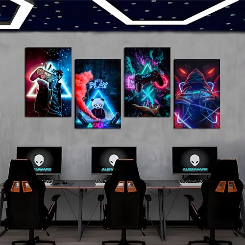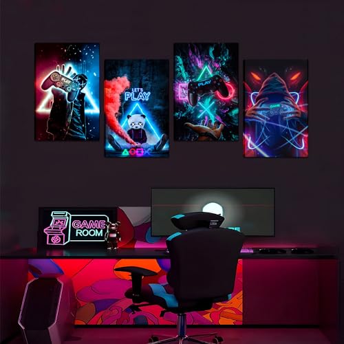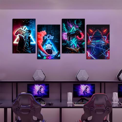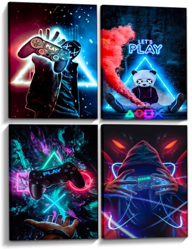 MUWAK - MUWAK Game Room Decor Wall Art Set of 4 - Cool Video Gamepad Wall Decor, Gaming Canvas Wall Art Posters Prints for Teen Boys' Room, Bedroom - Perfect Gamer Gifts - Framed 12x16 in