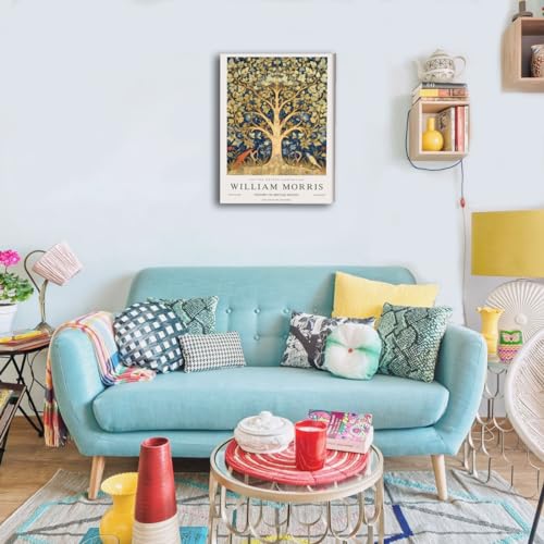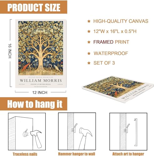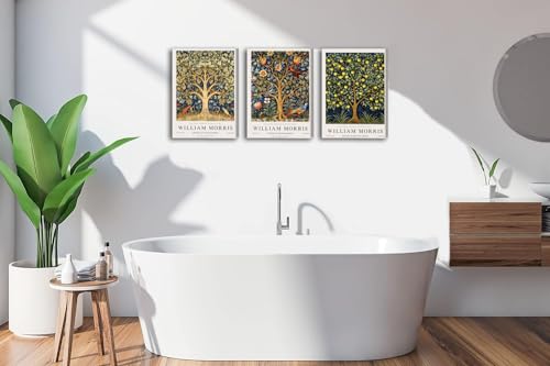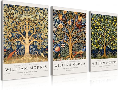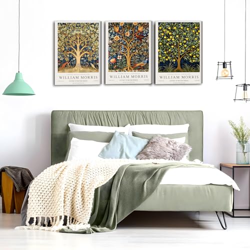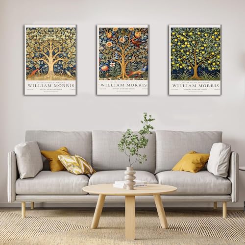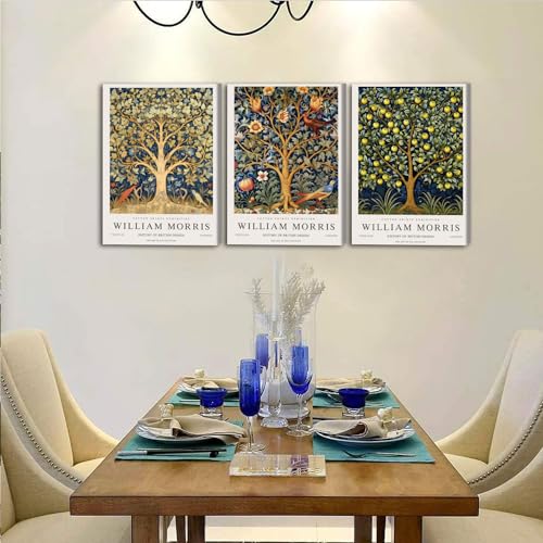MXU - ام اكس يو لوحة فنية جدارية من 3 قطع ملصقات مرحة لغرفة المعيشة والمطعم ومعرض متحف ويليام موريس جديدة بنمط فني جديد لشجرة الفاكهة والطيور بدون اطار برتقالي