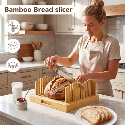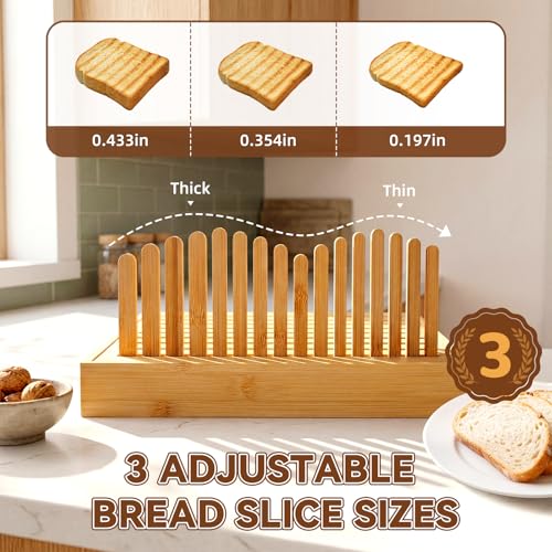 - مادة الخيزران وتصميم قابل للتعديل، قوي ومتين. تحتوي قطاعة الخبز هذه على فتحات قابلة للتعديل مع ثلاثة إعدادات سمك لشرائح متساوية، مثالية لتقطيع جميع أنواع المخبوزات.