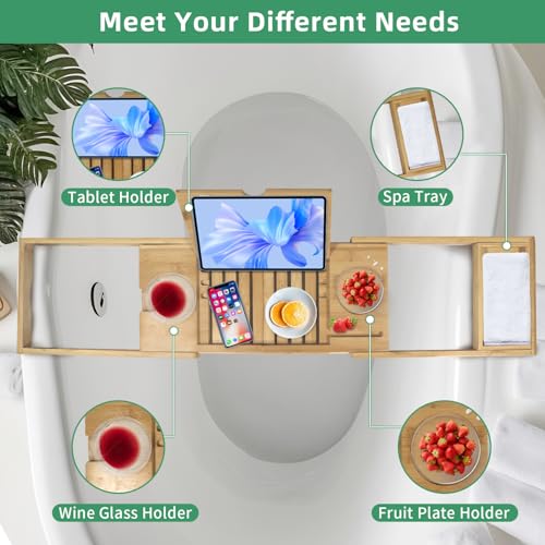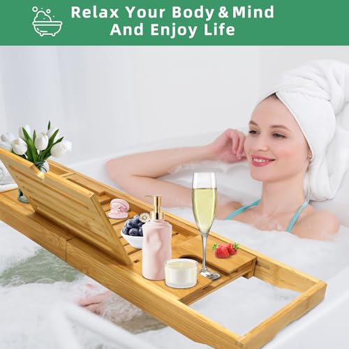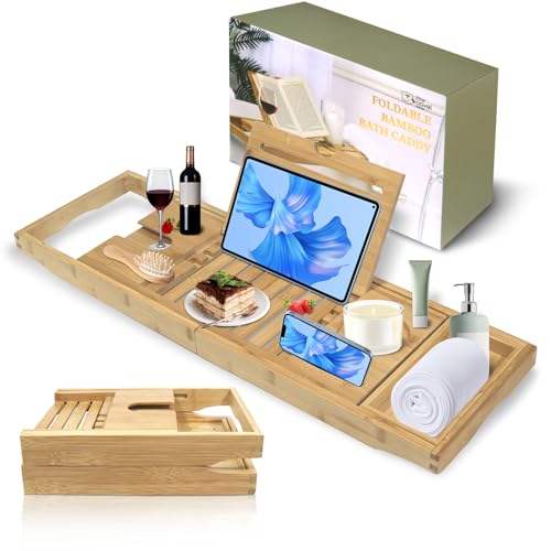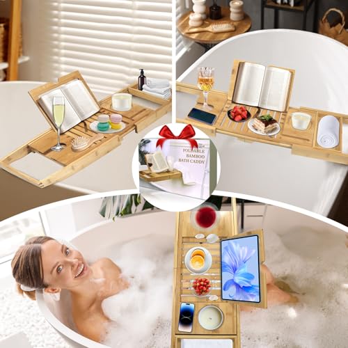 - The perfect gift: Imagine how delicious it is to have a glass of wine, a delicious snack and a favourite film on the bath tray after a long day. The bamboo bath caddy is the perfect choice for Valentine's Day, Mother's Day, Thanksgiving, wedding and other holiday gifts. Our bathtub tray is designed to create a luxurious and relaxing bath experience, and there is no better way to bring class and luxury to your bathroom than by placing this bathroom table on the bathtub.