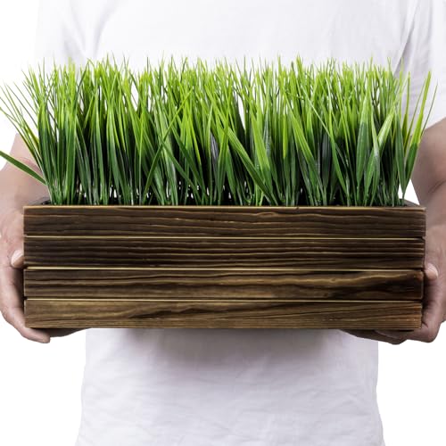 MyGift - MyGift 14 Inch Artificial Green Grass Plant in Rustic Burnt Solid Wood Rectangular Crate Style Planter Box, Indoor Decor Faux Greenery in Decorative Wooden Container