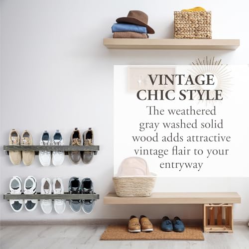 - Set of 2 wall mounted 30-inch vintage weathered gray solid wood footwear storage shelves keep up to 6 pairs of shoes neatly organized in coastal style **Some assembly required**