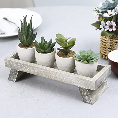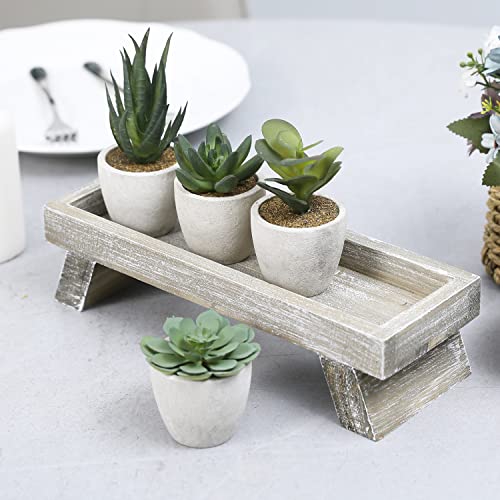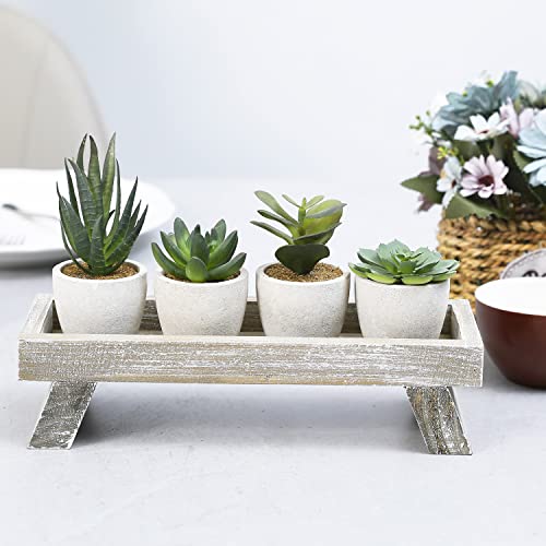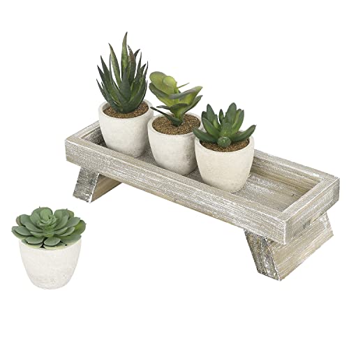 - 5 piece fake desk plant decorative display set with 4 mini artificial succulent plants in round planter pots and distressed wood stand; great for decorating around your home or in your office
