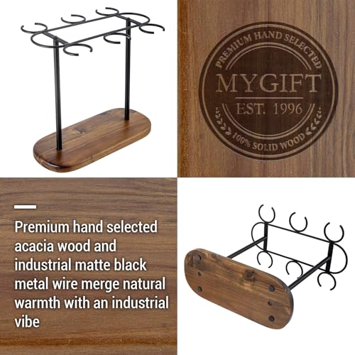 MyGift - MyGift 6 Glass Solid Acacia Wood and Matte Black Metal Wire Countertop Wine Glass Holder – Industrial Stemware Hanger Rack for Bar or Kitchen Display