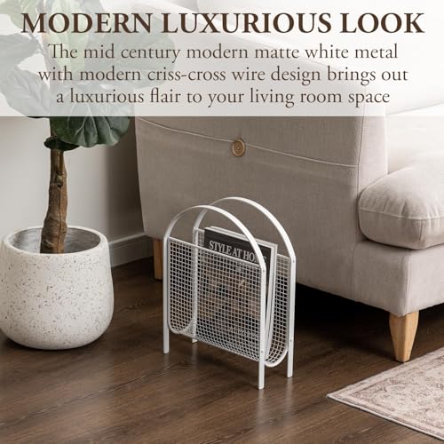 - رف حامل مجلات بإطار معدني أنيق مستوحى من منتصف القرن بلمسة نهائية بيضاء غير لامعة للمنزل أو المكتب أو العمل