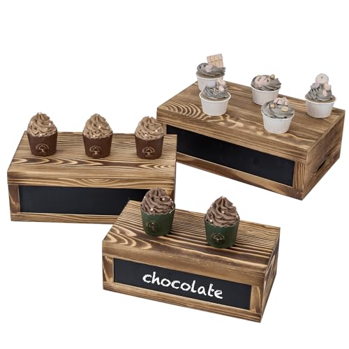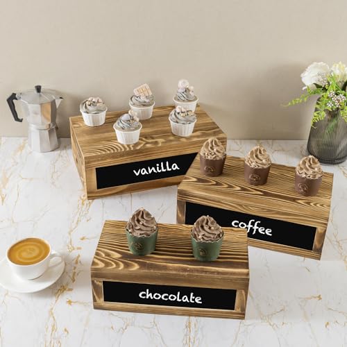 - 3-piece set of rustic burnt wood stackable dessert risers for serving baked goods to party guests at home, an event venue, or for retail merchandising