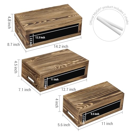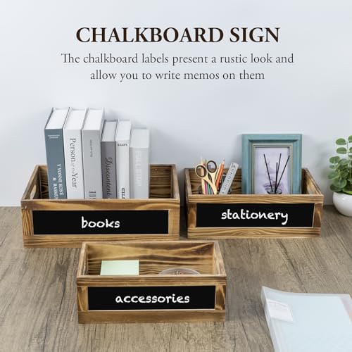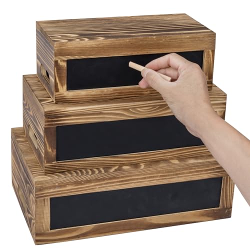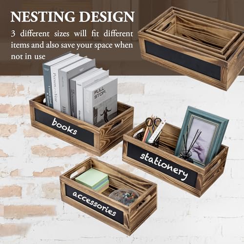 MyGift - MyGift Rustic Storage Bins, Burnt Wood Nesting Rectangular Boxes with Chalkboard Labels, Stackable Wooden Dessert Serving Display Risers, 3 Piece Set