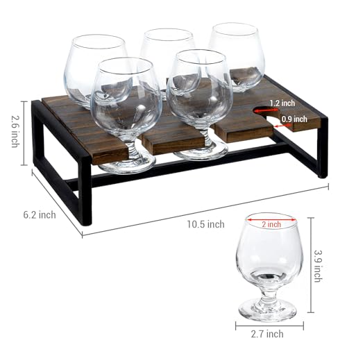 - تصميم صناعي من الخشب البني الداكن الصلب وصينية تقديم معدنية سوداء غير لامعة مع 6 أكواب تذوق صغيرة على شكل سنيفتر للمشروبات أو الويسكي أو عصير التفاح أو النبيذ أو المشروبات الروحية الأخرى