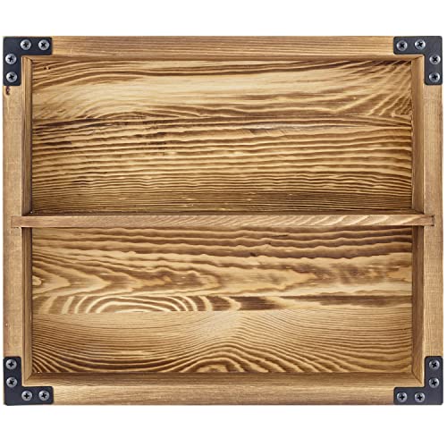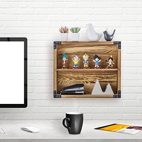 - Wall mounted wooden 2 tiered shadow box display shelving unit with burnt brown finish and industrial black metal corner brackets will showcase decorative items in your living room, kitchen, bedroom, or office