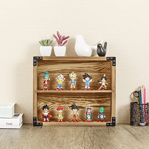 MyGift - MyGift Wall Mounted Display Shelf, 2 Tier Floating Solid Burnt Brown Wood Collectible Storage Shelves with Black Metal Bracket Accent