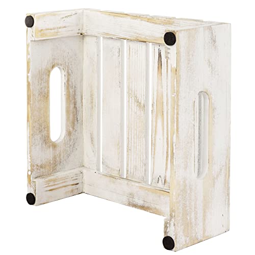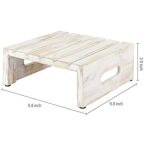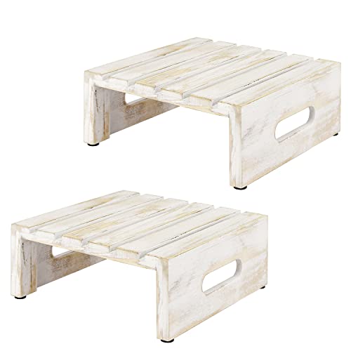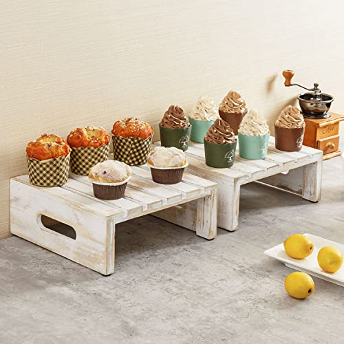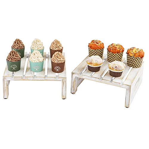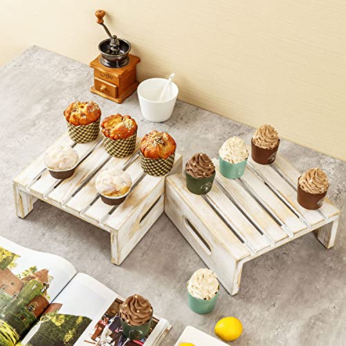 - Rustic whitewashed wood cupcake, cake and dessert display riser stands with slatted design and cutout handles for special occasions or everyday décor