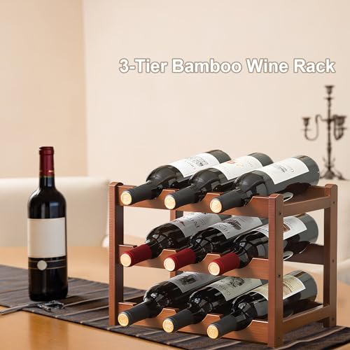 MYITYARD - رف مشروبات قائم بذاته مكون من 3 طبقات بسعة 9 زجاجات من الخيزران لسطح الطاولة من ميتيارد، حامل تخزين قائم بذاته للمنزل والمطبخ والمقهى والقبو والمخزن - بني