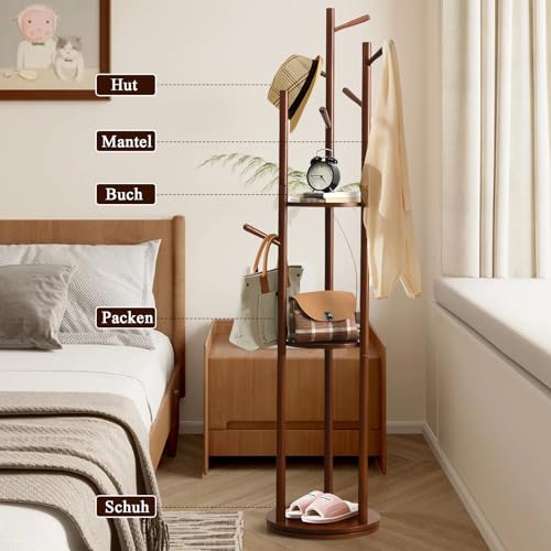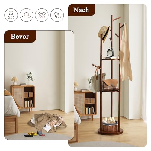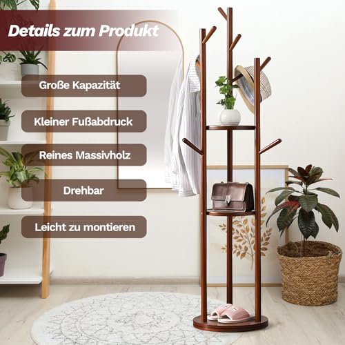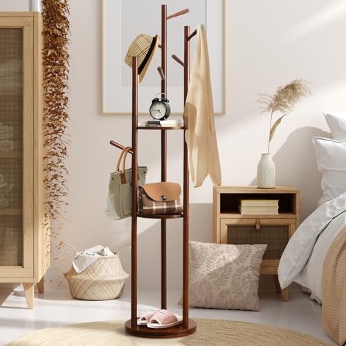MYOYAY - MYOYAY Rotating Clothes Rack with 9 Hooks/3 Shelves Wooden Coat Rack Freestanding Tree Shape Coat Rack for Clothes, Bag, Living Room, Bedroom, Office