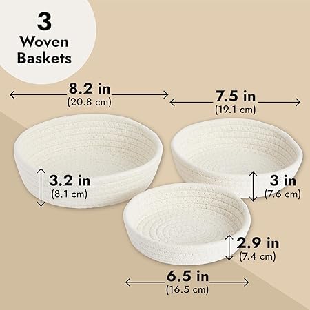 - WHITE WOVEN BASKETS: these white cotton rope small baskets come in three sizes, a stylish and practical storage solution for bedrooms, laundry rooms, bathrooms, entrances, and nursery
