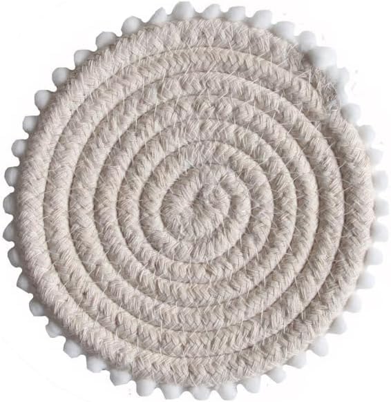 Generic - MZ Set of 4 Round Coasters for Drinks,Hand Weave Cotton Rope Coasters Set with Hairball,Boho Style Heat Insulation Cup Coasters Table Decor Cup Mats,white(washabel)(natural cotton)