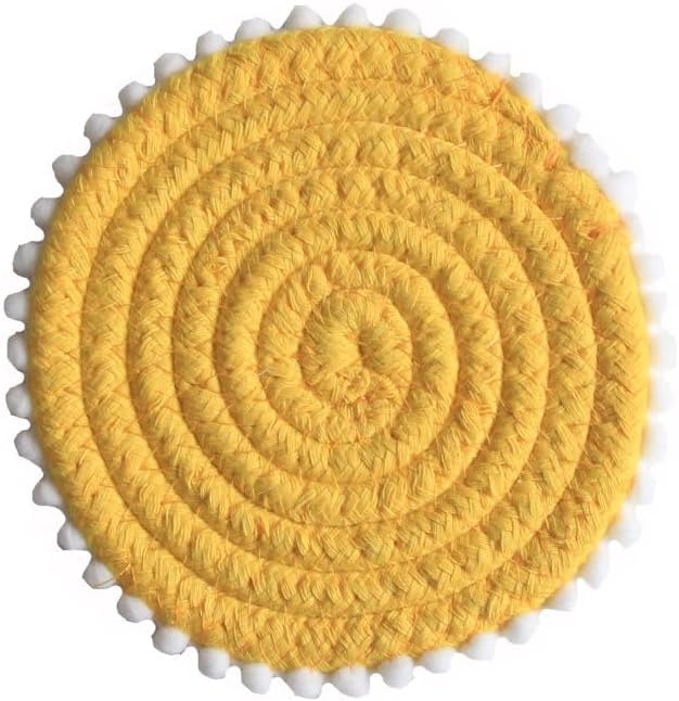 Generic - مجموعة قواعد اكواب دائرية للمشروبات من ام زد مكونة من 4 قطع، قواعد اكواب مصنوعة من حبل قطني منسوج يدويا مع كرة شعر، قواعد اكواب عازلة للحرارة بنمط بوهو لتزيين الطاولة، اصفر (قابلة للغسل) (قطن طبيعي)