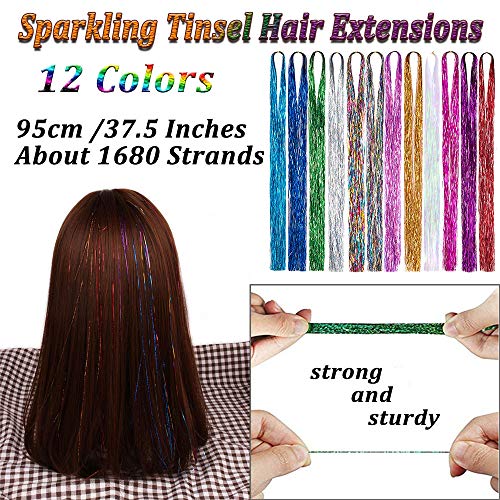 - 【Size and Quantity 】12 color hair tinsel is 38 inches long, each color has 150 strands. There are 1800 strands in our combination at least. You can adjust the length of hair tinsel according to the length of hair.