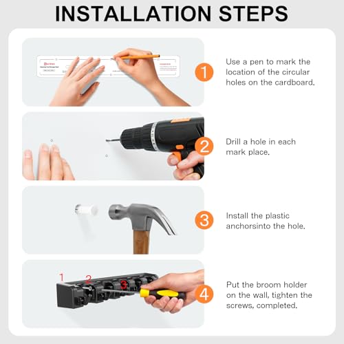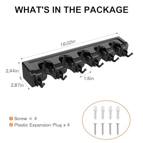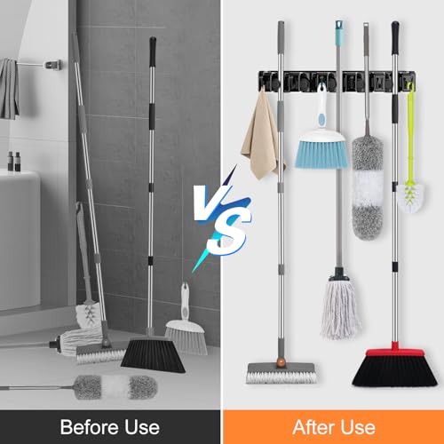- CLEANING TOOLS STORAGE RACK: This wall mounted broom rack is suitable for storing cleaning supplies, gardening tools, kitchen utensils and hardware tools. Our broom rack is the best companion for your kitchen, garage, laundry room, keeping your work area clean and tidy