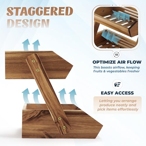 - STAGGERED DESIGN: The staggered design, complete with a slat bottom, promotes optimal airflow, keeping your produce fresh for longer periods. It also creates a visually appealing display that enhances your kitchen’s organization.