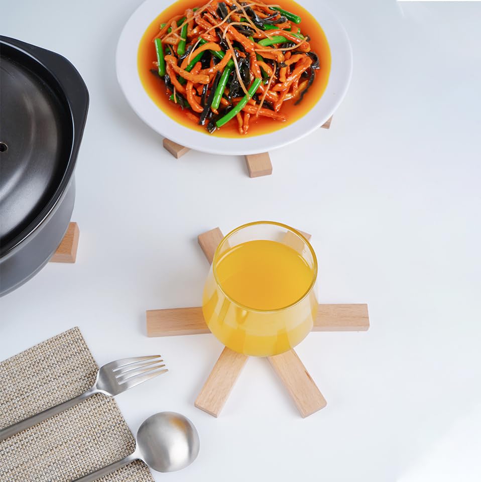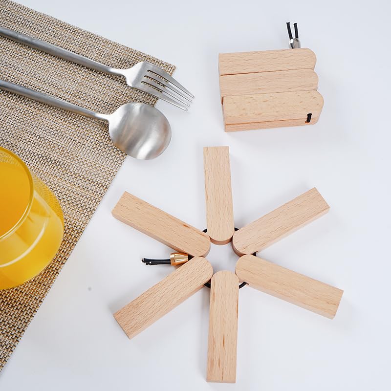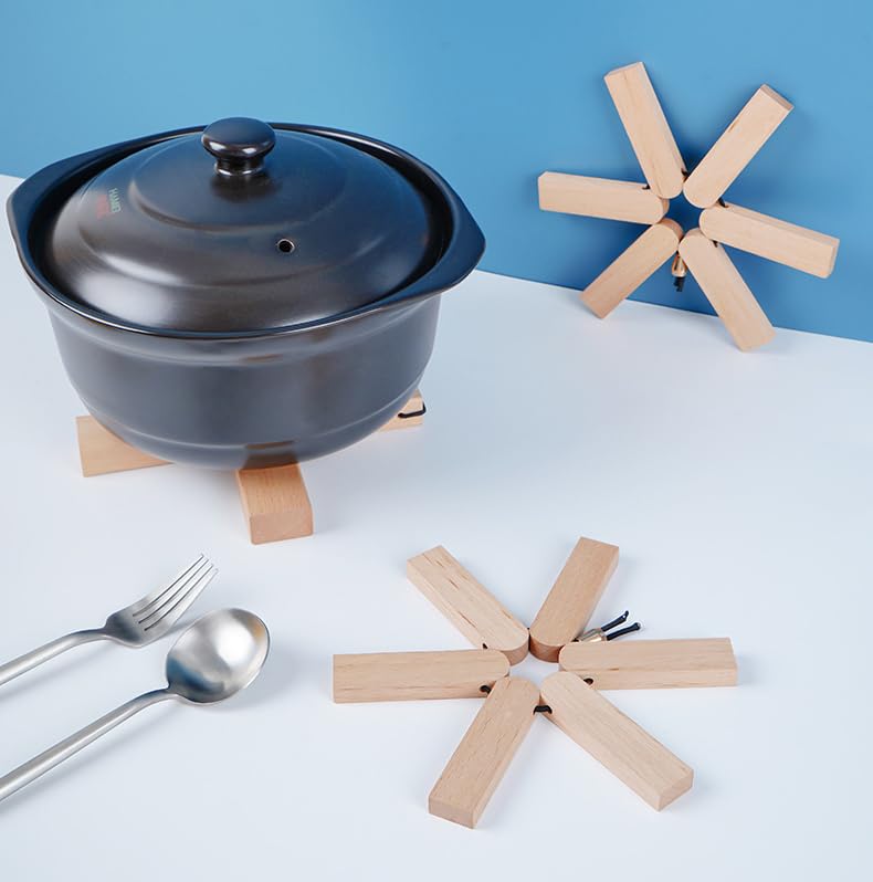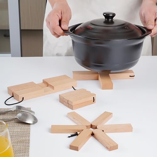 - 【Perfect Heat Resistance And Exquisite Appearance】: This wooden kitchen accessory set includes three heat-resistant trivets for hot pots and pans. Unfolded, each mat has an 8-inch diameter, making it suitable for all sizes of cookware. Effortlessly protect your tabletops and countertops.