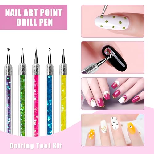 - Set of 5 dual-ended nail art brushes combining bristles and dotting tools for versatile decoration, perfect for drawing lines, flowers, and patterns with precision and smooth control.