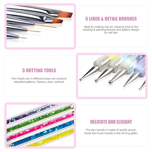 - The set includes brushes and dotting tools in various sizes, making it ideal for natural, gel, and acrylic nails both at home and in professional salons.