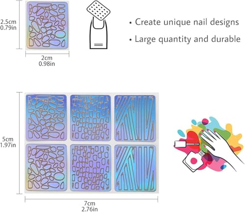 - محتويات العبوة: 12 ورقة من استنسل الأظافر (يبلغ مقاس كل ورقة 7 × 5 سم) لكل منها 6 ملصقات فينيل صغيرة (كل منها 2 × 2.5 سم)، بإجمالي 144 قطعة.