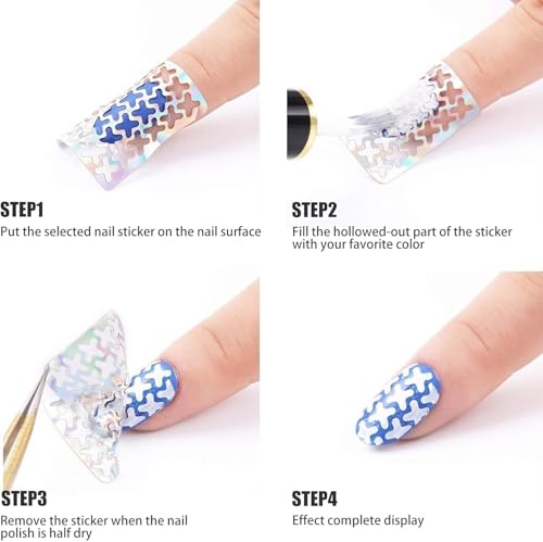 - نماذج مختلفة: يحتوي كل نموذج على ملصقات متعددة يمكن استخدامها لنفس أنماط الأظافر أو أنماط مختلفة وفقًا لأسلوبك المفضل. يحتوي على العديد من الزخارف المختلفة: الزهور، والقلوب، والخطوط المتعرجة، والخطوط المستقيمة، والخطوط المنحنية، والنجوم، والفراشات، إلخ.