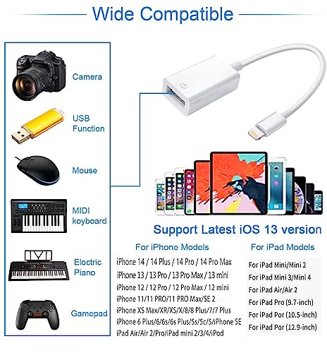- The USB camera adapter supports standard photo formats like JPEG and RAW, along with SD and HD video formats including H.264 and MPEG-4; compatible with iphone 14/14 Plus/14 Pro/14 Pro Max/13/13 Mini/13 Pro/13 Pro Max/12/12Mini/12Pro/12 Pro Max/11/11 Pro/11 Pro Max/Xs/Xs Max/X/8/8 Plus/7/7Plus/6/6 Plus/5/5S/SE and Air /Mini /Pro.