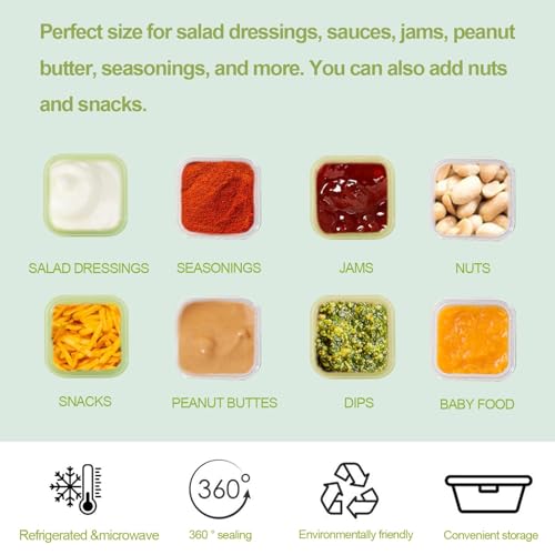 - Mini Size: Each container measures 2" x 1.6" and holds 2oz (60ml), making it ideal for packing sauces, salad dressings, peanut butter, jams, and snacks.