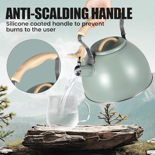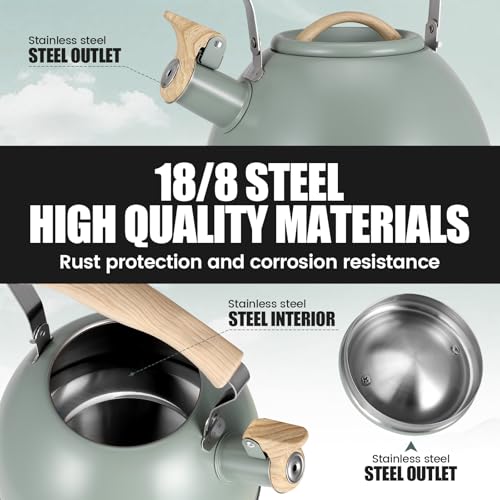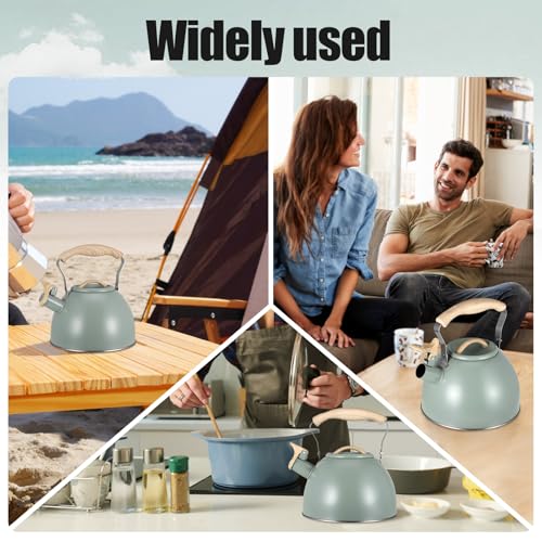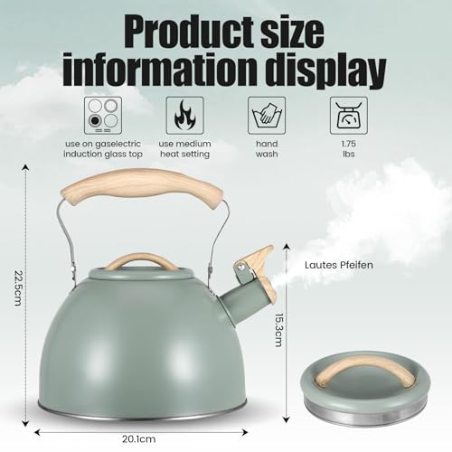 Nastopee - 3L Whistling Kettle, Stainless Steel, Green, Wooden Handle, Compatible with All Cooker Types
